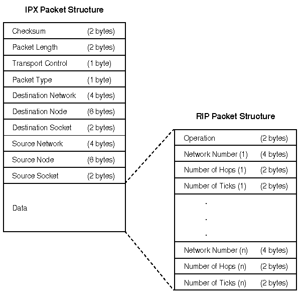 The RIP packet structure is shown in ``RIP packet structure''. This structure is enveloped within the data area of IPX.