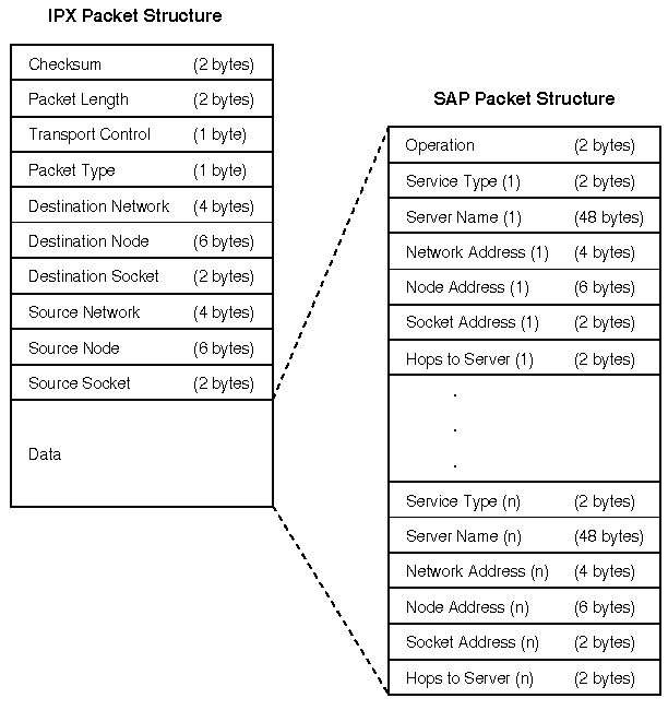 Like RIP, SAP uses IPX and a medium-access protocol for its transport. ``SAP Packet Structure'' illustrates the structure of a SAP packet.