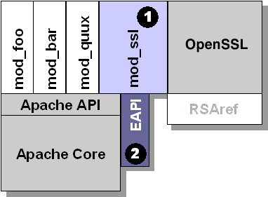 The mod_ssl package consists of the SSL module (part 1 in Figure 1) and a set of source patches for Apache adding the