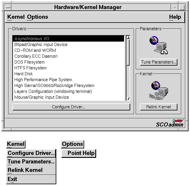 Enter scoadmin hardware/kernel manager on the command line.
