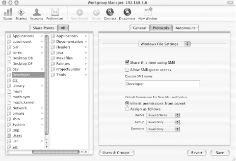 Underneath the GUI, a lot of activity takes place to offer Windows Services. In the non-Server version of Mac OS X, selecting Windows File Sharing sets the SMBSERVER parameter in /etc/hostconfig and triggers the Samba startup item. In Mac OS X Server, under normal circumstances the Samba startup item and the SMBSERVER parameter are never used.