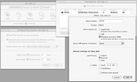 Printer shares are set up differently. First, launch Server Settings; under the File & Print tab, select Print, then Configure Print Service.... Check the box labeled Automatically share new queues for Windows printing. Next, click the Print icon again and then Show Print Monitor. Make sure the printers you want to share are listed. Printers directly attached to the server should have queues created automatically, but remote printers you wish to reshare must be added by clicking New Queue and discovering or specifying the printers. When you're finished, click Save, select the Print icon one more time, and select Start Print Service. See Figure F-2.