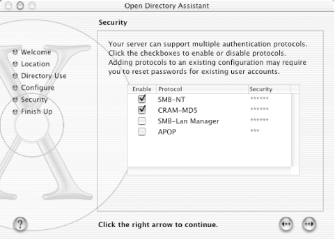 To enable Password Server or merely check its settings, start the Open Directory Assistant. Unless you wish to change any of the settings, just click the right arrow button in the lower-right corner of the window until you get to the first Security step. At this point, activate Password Server by selecting the option marked Password and authentication information will be provided to other systems. The next step displays the main administrative account, and the one after that gives you a choice of authentication protocols to enable (see Figure F-4). Make sure that SMB-NT is checked, and check SMB-Lan Manager if you have Windows 95/98/Me or older clients. The final step saves the Password Server configuration and prompts you to reboot.
