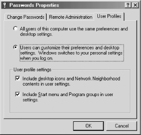 In addition to the domain features of that we discussed in Chapter 1, having a domain makes it possible to use logon scripts and roaming profiles (also called roving profiles). A logon script is a text file of commands that are run during startup, and a profile is a collection of information regarding the desktop environment, including the contents of the Start menu, icons that appear on the desktop, and other characteristics about the GUI environment that users are allowed to customize. A roaming profile can follow its owner from computer to computer, allowing her to have the same familiar interface appear wherever she logs on.
