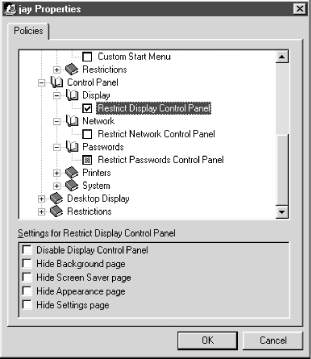 Creating a good system policy file is a complex topic, which we cannot cover in detail here. It would take a whole book, and yes, there happens to be an O'Reilly book on the subject, Windows System Policy Editor. Another definitive source of documentation on Windows NT system policies and the System Policy Editor is the Microsoft white paper Implementing Policies and Profiles for Windows NT 4.0, which can be found at http://www.microsoft.com/ntserver/techresources/management/prof_policies.asp.