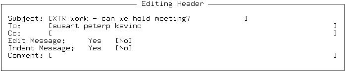 In the ``Comment'' field, you can enter a one-line comment to go with the message. SCO Shell Mail inserts the comment, along with your login, at the top of the message.