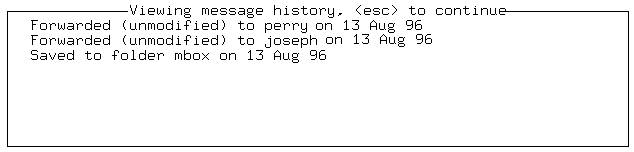 Once a message reaches your system mailbox, SCO Shell Mail keeps a history of what you do with it. It takes note whenever you save the message or its attachment, forward the message, or reply to the message. You might want to examine the history of a message to see if you replied to a particular person, or when you replied. To see the history of the current message, select: