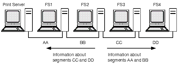 Taking these rules into account, the information that FS2 would broadcast to segment BB would be information about segments CC and DD.