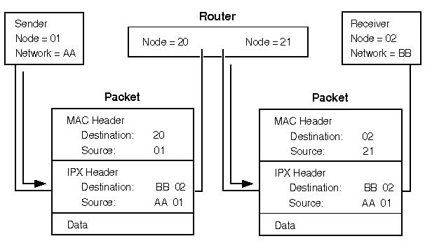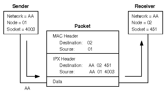 The sending node (node 01) sends a packet to node 02. The sending node places node number 02 in the destination field and node number 01 in the source field of the MAC. In the destination address fields of the IPX header, the sending node places AA, 02, and 451 (the full IPX address of the receiving node). The sending node places its own IPX address of AA, 01, and 4003 in the source address fields of the IPX header.