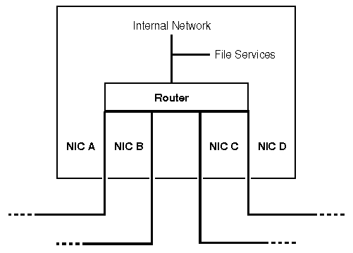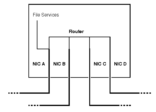Within the 286-based environment, the services of a file server are addressed with respect to its first NIC, A. This convention guarantees consistency because every server will have at least one network adapter installed. ``Addressing of file services on a 286-based NetWare file server'' illustrates this convention.