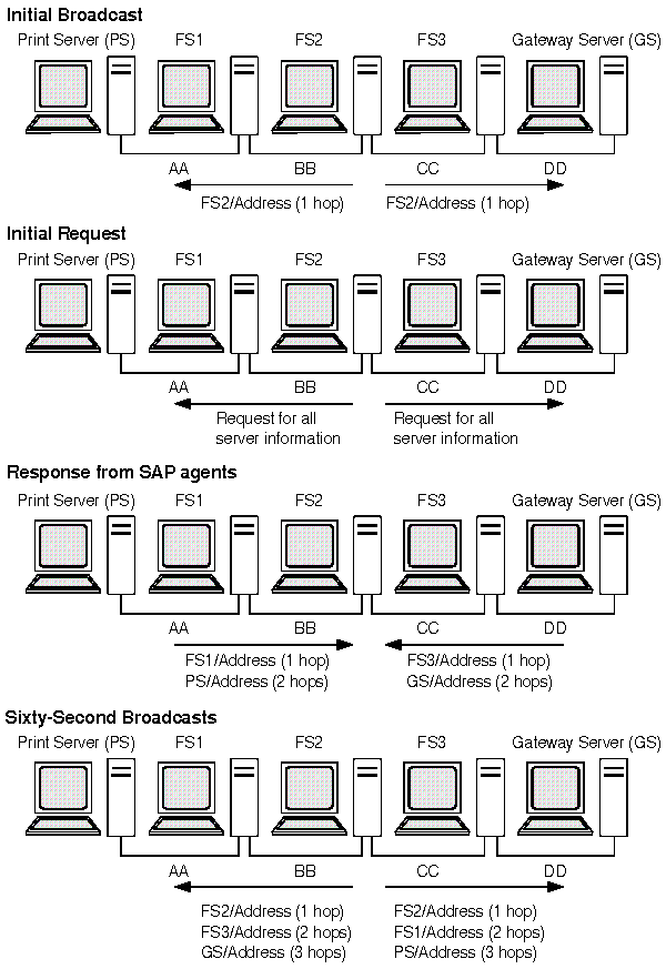 The SAP broadcasts that servers perform are local broadcasts and, therefore, only received by SAP agents on their connected segments. Consequently, SAP agents periodically broadcast their server information so that all SAP agents on the network have information about all servers that are active on the network -- this is the same broadcast method used by routers to distribute and exchange network number (RIP) information.