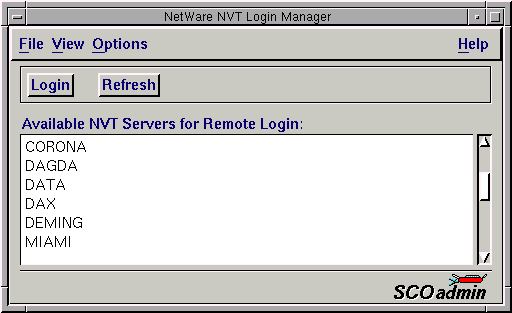The NetWare NVT Login Manager allows users to log into one or more NVT servers simultaneously by selecting the desired servers and pressing the Login button. When the NetWare NVT Login Manager is used in a graphical X-windows environment, one window is opened for each server to which the user logs in. Each window will contain a login prompt for the associated server. When the NetWare NVT Login Manager is run in non-graphical mode (that is, character mode, or "CHARM"), only one server at a time can be logged into. In this case, the window in which the NetWare NVT Login Manager is running will be "taken over" by the remote login session. When the session is complete, control will automatically be passed back to the NetWare NVT Login Manager .