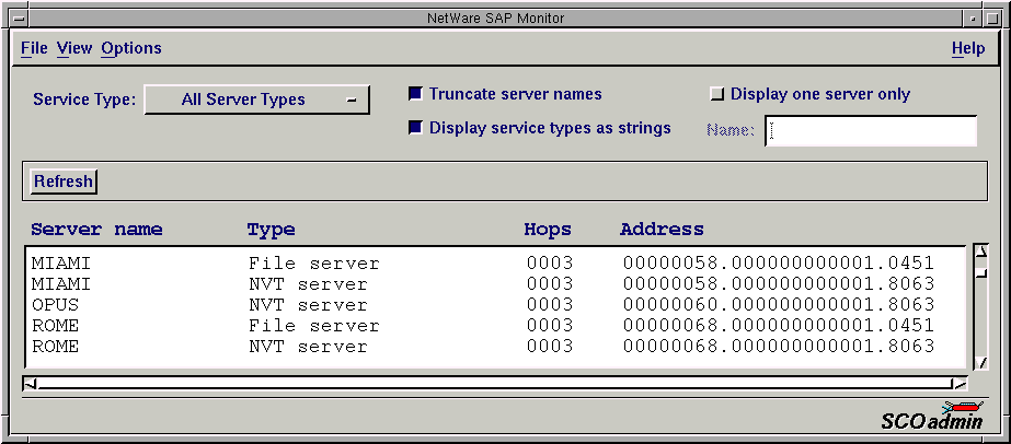 The Service Advertising Protocol daemon (SAPD) included with SCO IPX/SPX constantly receives information about the services available on the NetWare network via SAP broadcasts. The NetWare SAP Monitor and the corresponding showsvcs(PADM) command display the SAP information in a convenient format, allowing selective display based on server type and/or name. The output from this command is useful to ensure that services are available on the network.