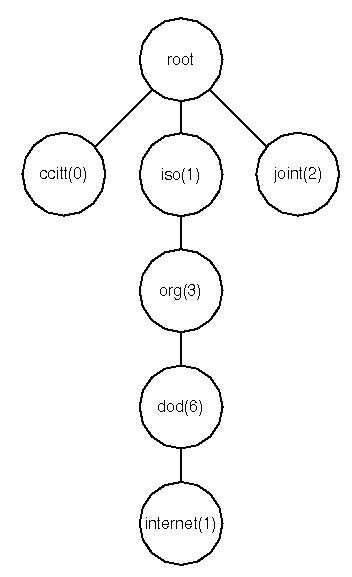 The root of the OID tree has no label. Currently, there are three children of the root, ccitt(0), iso(1), and joint-iso-ccitt(2). The ISO node has many children, one of which is org(3), which is allocated for international organizations. Under org(3) is the U.S. Department of Defense, dod(6), which has the child internet(1).