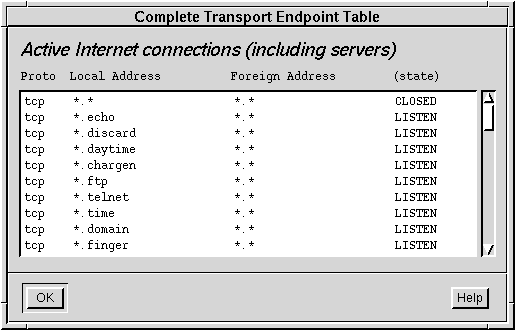 You can see all active Internet connections for different services by selecting Transport Table from the SNMP Agent Manager's Stats menu: