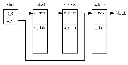 The cblock command allows you to examine the contents of the character blocks for a clist given its table entry displayed by the tty command. This may be useful if you wish to examine the a serial line which you think may be generating spurious characters. ``A character list formed from a chain of character blocks'' illustrates how a character list is built from a clist header and a chain of cblock elements. The clist header contains pointers to the first and last cblock only. The total count of characters in the c_data buffers is stored in the c_cc member of the clist.