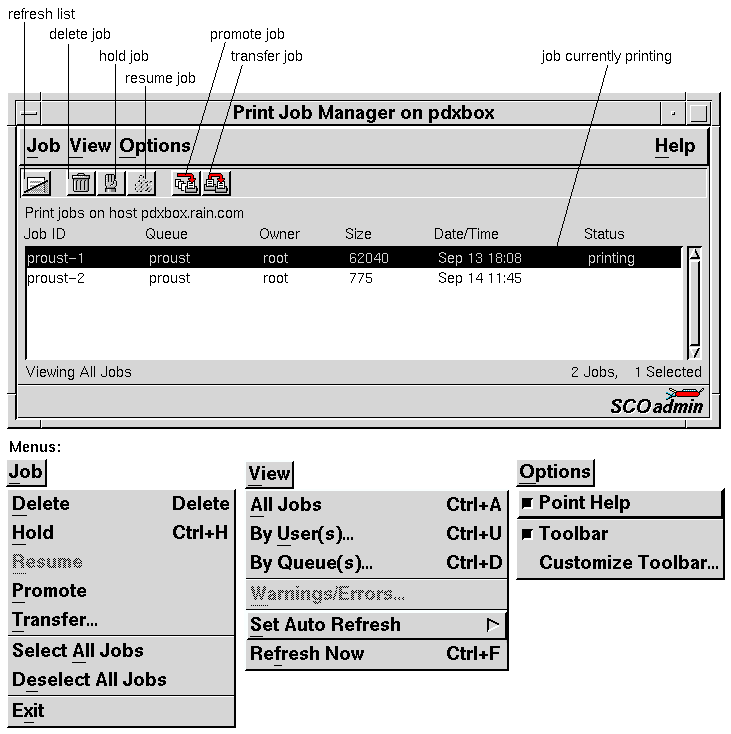 Enter scoadmin print job manager on the command line