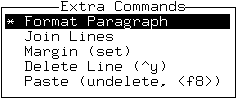 To choose a command from this list, position the highlight bar over the command that you want and press <Enter>. To use the Format Paragraph, Delete Line, and Join Lines commands, you must position the cursor on the line or paragraph that you want before pressing <F9>.