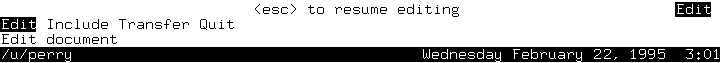 From within the editor, other functions are available; to use these other functions, press <Esc> while editing a file. The Edit menu appears, with the following options: