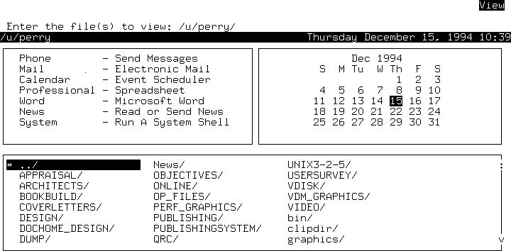 You can display the contents of a file on your screen with the View option. When you select View, a listing of the files and subdirectories in your current directory appears. Here is an example: