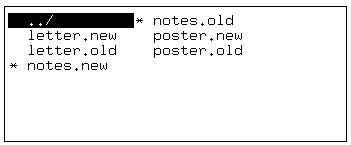You can also select several files at a time. If you are selecting files via the point-and-pick list, move the highlight to each file you want and press the <Space> bar. Each time you do this, an asterisk (*) appears in front of the filename. When you have finished, press <Enter> to select every file marked with an asterisk. In this example, the files notes.old and notes.new have been selected:
