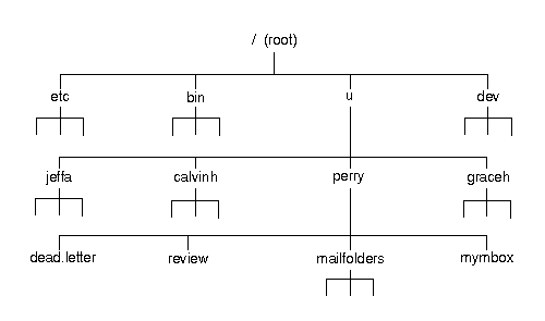 Every directory (except one) is a subdirectory of some other directory. The directories are organized into an inverted tree structure, so called because directories branch out of other directories like the branches of a tree. This tree is ``inverted'' because the branches move down, not up. One directory, at the top of the tree, is not a subdirectory of any other directory. This is called the root directory, and its name is a slash character (/). To help clarify this, look at the following picture of part of a typical directory tree. (Note that directories have small sub-trees below them; files do not.)