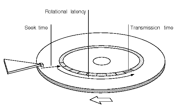 A hard disk's performance is characterized by its access time; this is the sum of the seek time taken by the head to move to the correct track, the rotational latency while the disk rotates until the head is over the desired block, and the transmission time needed to transfer data to or from the block as shown in ``The performance characteristics of a hard disk''.