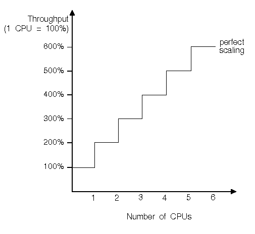 If the operating system can gain extra performance in direct proportion to the number of processors, it is said to exhibit perfect scaling as shown in ``Perfect multiprocessor scaling''. In practice, the processors have to compete for other resources such as memory and disk, they have to co-operate in how they handle interrupts from peripherals and from other CPUs, and they may have to wait to gain access to data structures and devices.