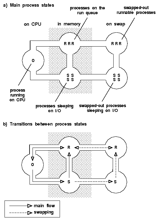 As soon as a process has been created, the system assigns it a state. A process can be in one of several states. You can view the state of the processes on a system using the ps(C) command with the -el options. The ``S'' field displays the current state as a single letter.