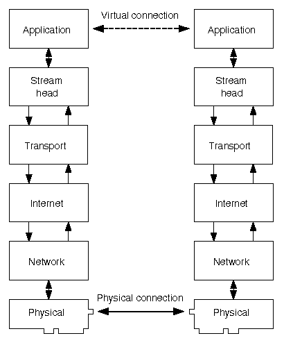 ``Virtual and physical connections over a network'' shows protocol stacks on two machines linked via a physical connection technology such as Ethernet, Token Ring or Fiber Distributed Data Interface (FDDI). Applications appear to have a direct or virtual connection; they do not need to know how connection is established at the lower levels.