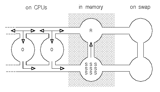 ``Process states on a multiprocessor computer'' shows how we can modify the process state diagram introduced in ``Process states'' and apply it to a multiprocessor system. Note that this diagram implies that the kernel not only has to consider when to run a process but also on which CPU to run it.