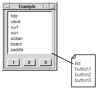 In the example above, there are four widgets which could be made globally accessible: a list and three buttons. After calling VxSetVar, each widget will have a unique handle stored in a variable (for example, the variables could be named list, button1, button2, and button3).