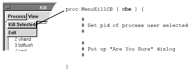 The first callback, MenuKillCB, is invoked each time a user selects Kill Selected from the Process menu, or double-clicks on an item in the process list.