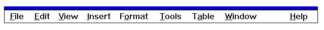 This is a horizontal bar at the top of a main window that lists available topics. Menu bar topics are headings that lead to pull-down menus (or cascades) of commands. Menu bar topics are not commands themselves. Menu structure and naming should be based on the task analysis. When Motif menus or commands apply, they should be used. If they do not, then they do not need to be used. The following MS Word for Windows menu bar (modified with Help at the far right for Motif style), demonstrates a standard menu bar arrangement: