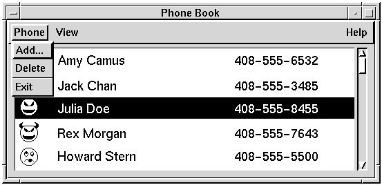 SCO Visual Tcl is a set of extensions to Tcl which enable you to write applications, from simple applications, such as the phone book shown here, to highly complex applications, such as the SCOadmin Software Manager. Each of the SCOadmin managers included with SCO OpenServer was written using SCO Visual Tcl.