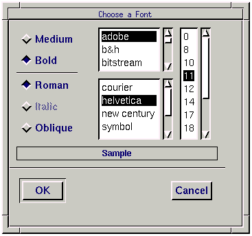 2. Click on an item in the font, style, and type-size lists. As you choose an item, it is highlighted, and an example appears at the bottom of the dialog box.