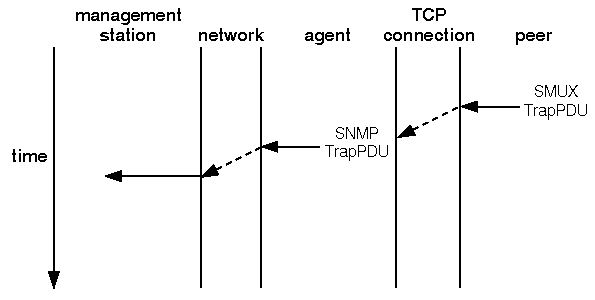 You will recall from ``Asynchronous events'' that a peer sends an unsolicited ``trap'' message to the agent when the peer detects an unusual event or condition. This trap message is sent in a TrapPDU; the sequence of events in this operation is represented in ``An SNMP ``trap'' operation''.