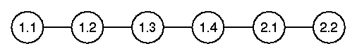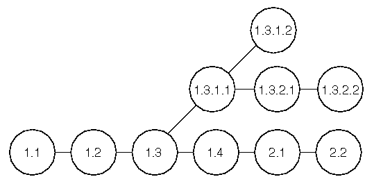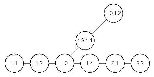 The branch number of the first delta branching off any trunk delta is always 1, and its sequence number is also 1. For example, the full SID for a delta branching off trunk delta 1.3 will be 1.3.1.1. As other deltas on that same branch are created, only the sequence number changes: 1.3.1.2, 1.3.1.3, and so forth. This is shown in ``Tree structure with branch deltas'':