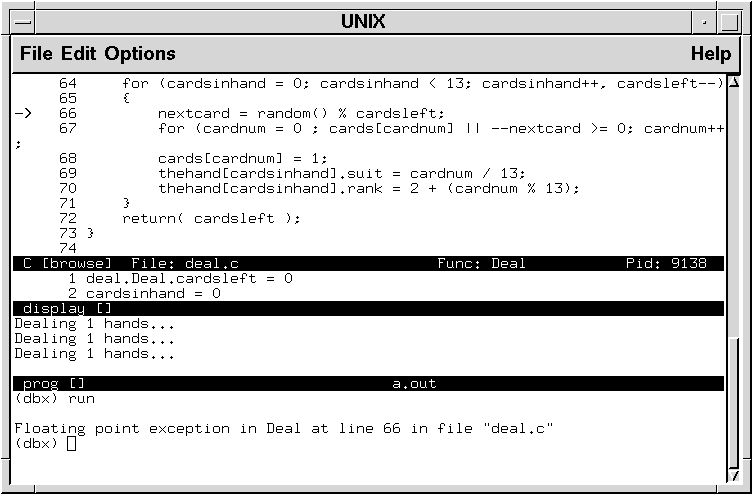 The source window displays the source file being debugged.