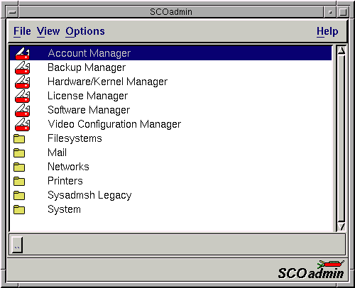To ascend the directory tree, click on the parent directory button in the lower left hand corner of the SCOadmin window, or select Parent from the View menu.