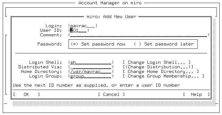 ``Sample character SCOadmin screen'' is a character-mode screen from the Account Manager. To navigate this screen from top to bottom, press the <Tab> key. There are two rows of buttons: the ``Password'' selection box and the OK, Cancel, and Help pushbuttons. Use the arrow keys to move between the buttons.