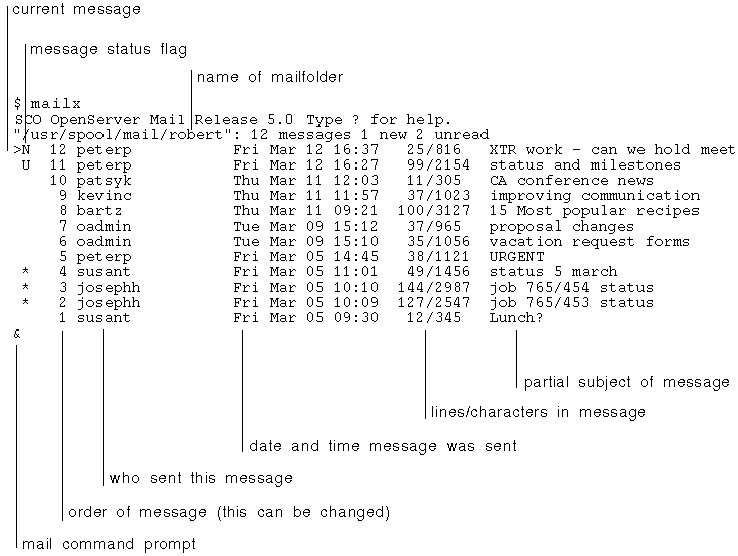 To start mail(C), type mail on the UNIX command line and press <Enter>. The opening screen shows the headers of the messages waiting in your system mailbox: