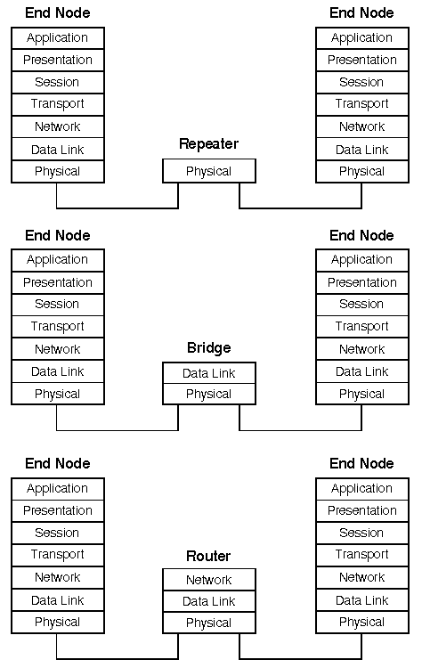 A repeater is a physical layer (OSI model) device that amplifies the signal of one segment onto one or more other segments. Repeaters are used to extend the maximum possible distance between end nodes on a segment. They are completely transparent to the sending and receiving nodes.