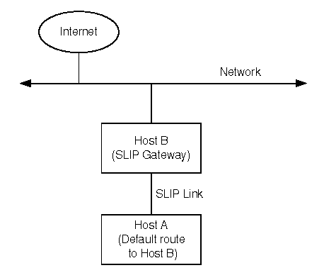 This scenario assumes that host A needs to access the Internet but has no direct access. To gain Internet access, host A must use SLIP to connect to host B, which does have Internet access. Host B must act as a gateway to the Internet for host A. The special configuration issues for this scenario are: