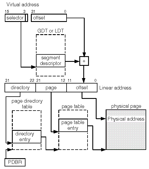 The upper 13 bits (3 through 15) of a segment selector holds the entry in the Global Descriptor Table (GDT) used by the kernel, or a process's Local Descriptor Table (LDT). The lower three bits indicate whether the descriptor table belongs to the kernel or a user process and its privilege level. A segment's descriptor table entry stores (among other things) its base linear address; this is added to the offset to produce a linear address. (This intermediate linear addressing enables non-contiguous physical pages to appear contiguous within a segment.)