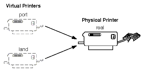 The print spooler system differentiates printers by name only, not by the device to which the printer is connected. To specify different names for the same device and prevent multiple print jobs from appearing simultaneously, you must set up both the real printer and additional virtual printers. The real printer performs the actual printing and the virtual printers pass print jobs to the real printer.