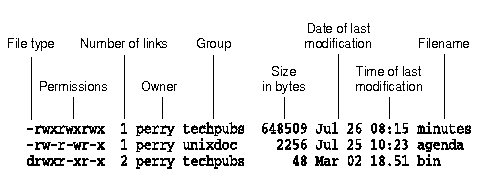 l is another way of saying ls -l. A long listing shows you, from left to right, the file type, the permissions on the file, the number of links to the file, the owner of the file, the group of the file, the size of the file in bytes, the date and time the file was last modified, and the name of the file. If a file has not been modified since last year, the year appears instead of the modification time.