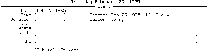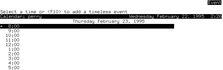 4. If you want to select a time slot which is not displayed, press <F10>. This allows you to enter a timeless event or specify a start time other than those displayed. The following is an example of a timeless event form: