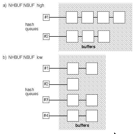 On a multiprocessor system, the system sets the number of hash queues to the nearest power of 2 that is greater than or equal to twice the value of NBUF. The reason for this can be seen from ``Keeping the ratio of hash queues to buffers low reduces contention for SMP''. On a system with an SCO SMP License, the kernel running on one CPU locks the entire hash queue when it accesses a buffer. The kernel running on another CPU that wants to access the same hash queue must wait until it is released. Such contention can be avoided by keeping the ratio of hash queues to buffers low. For example, if the value of NBUF is 32000 on a system with an SCO SMP License, you should set NHBUF to at least 65536.