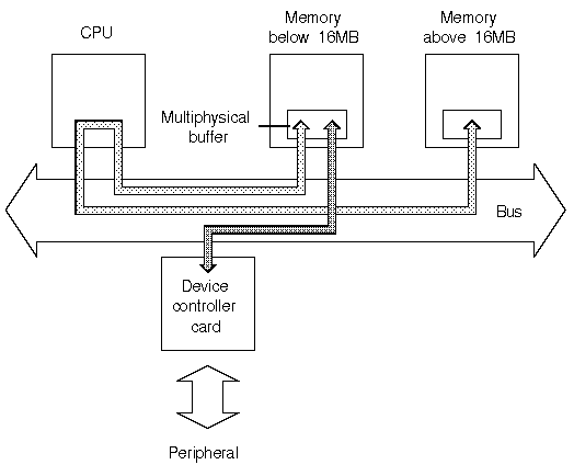 How the system uses multiphysical buffers to overcome 24-bit addressing limitations